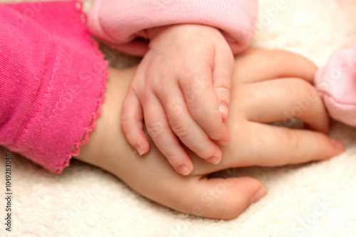 Two small hands clasp together, symbolizing love and connection between siblings during a peaceful moment at home