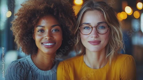 Two Smiling Diverse Young Women One with Curly Hair and One with Glasses Standing Together in a City Street and Expressing Friendship Positivity and a Sense of and Togetherness