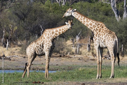 Two southern giraffes (Giraffa camelopardalis) on the Khwai River bank, Botswana