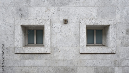 Two square windows in a light gray stone wall