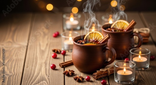 Two steaming mugs of mulled wine on rustic wooden table with candles. Warm Christmas drink with orange, star anise, cinnamon stick.