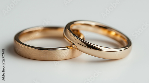 Two stunning gold wedding rings glisten under soft lighting, symbolizing eternal love and commitment. Their smooth surfaces and warm hues create a romantic ambiance, ideal for a wedding setting