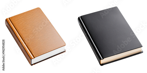 Two stylish notebooks in brown and black leather isolate on transparent background, cutout, png