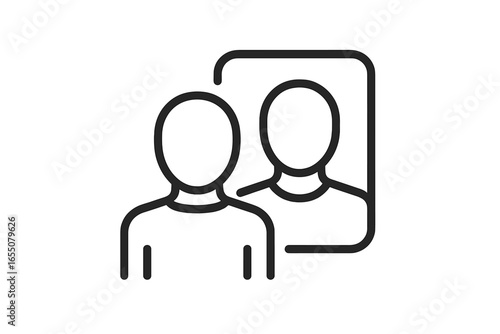Two stylized human figures with simplified features and a framed silhouette in a minimalist design
