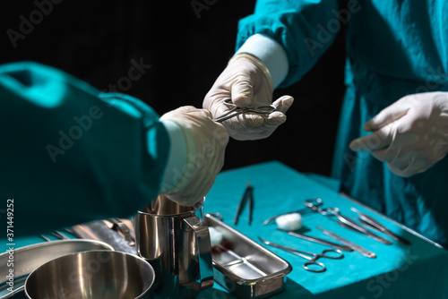 Two surgeons working in operating room, one hand over surgical equipment to another. Surgeons hands holding surgical scissors and passing surgical equipment,