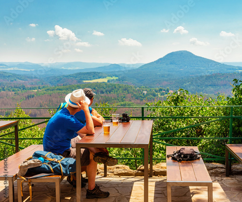 Two tourists drink beer in a cafe in an open area in the mountains. Czech Switzerland, Prebischtor