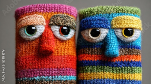 Two vibrant knitted characters stand side by side, showcasing their colorful stripes and distinct facial features. The cozy environment enhances their playful appearance.