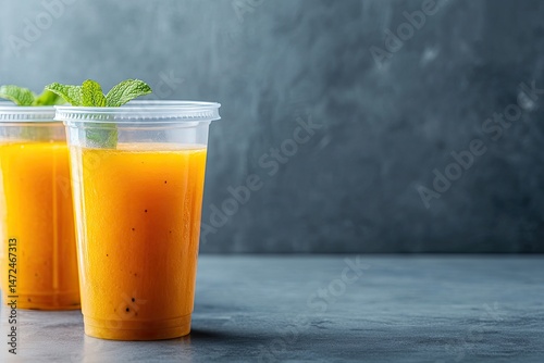 Two vibrant orange smoothies in clear plastic cups, garnished with fresh mint sprigs