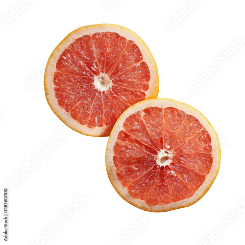 Two vibrant slices of a ruby red grapefruit are isolated on a clean white backdrop, showcasing their juicy pulp and refreshing citrus appeal for healthy eating.