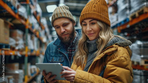 Two warehouse workers using a digital tablet while recording inventory. Logistics employees working with warehouse management software in a large distribution centre.