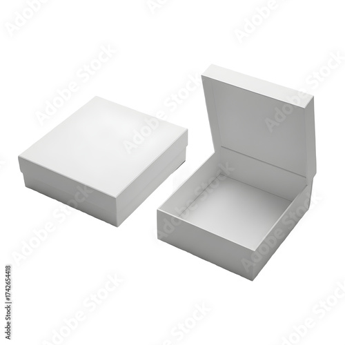 Two white cardboard boxes, one closed and one open, isolated on transparent background