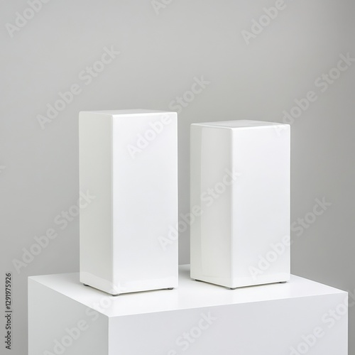 two white minimalist loudspeakers on a display plinth