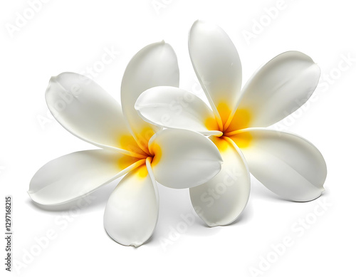 Two White Plumeria Flowers with Yellow Highlighting Detail, Isolated on White Background
