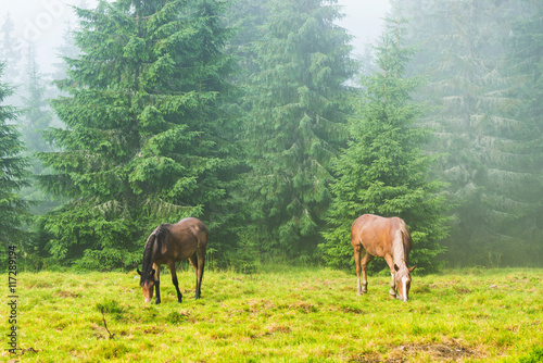 Two wild running horses grazing