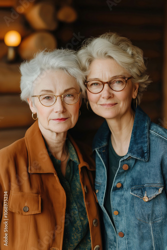 Two women with gray hair stand close together in a cozy cabin, smiling warmly in autumn