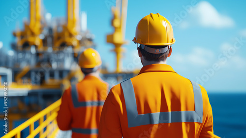 Two workers in orange uniforms and helmets supervise an offshore oil platform against a clear blue sky.