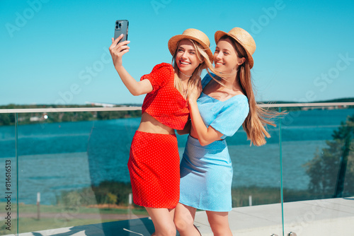 Two young beautiful smiling hipster women in trendy summer same clothes. Carefree models posing in the street. Positive models having fun. Cheerful and happy, at sunny day. In hat, take selfie