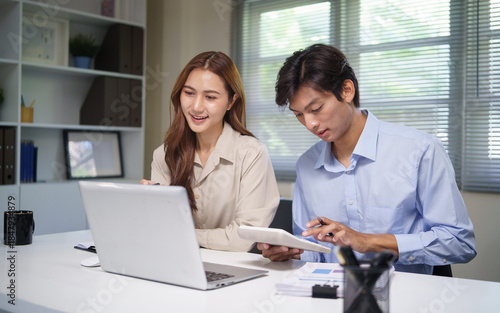 Two young professionals working together at a desk, reviewing financial data on a laptop and calculator.