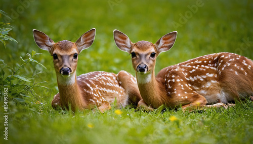 Two young spotted deer lie on their sides in green grass, looking directly at the camera
