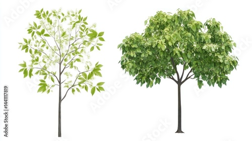 Two young trees, spring and summer, isolated, white background, landscaping design