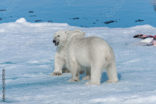 Two young wild polar bear cubs playing on pack ice in Arctic sea, north of Svalbard