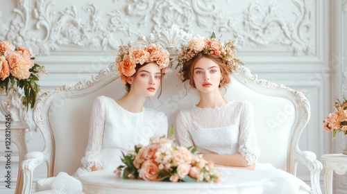 Two young women in floral crowns sit on a white chaise lounge, creating a romantic and elegant scene.