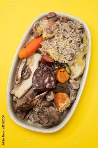 typical portuguese dish meat, smoked sausages and vegetables on the dish