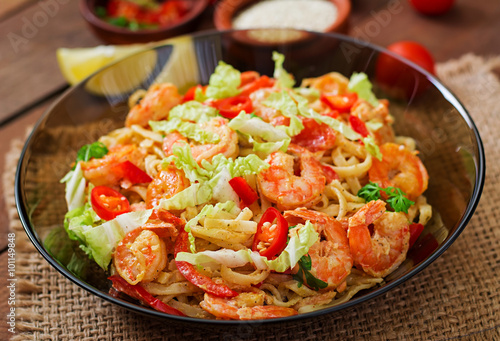 Udon pasta with shrimp, tomatoes and paprika.