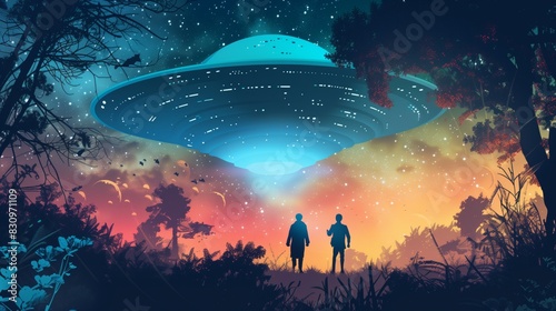 UFO Hovering Over Evergreen Forest Illuminated by Twilight Sky