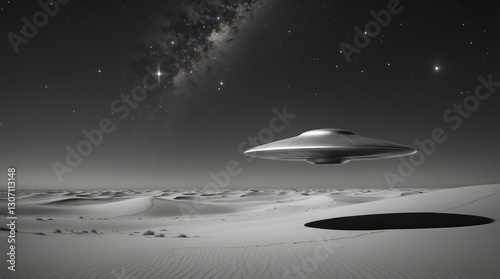 UFO hovers above desolate desert landscape under a starry night sky with visible galaxy
