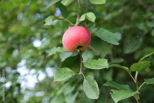 ugly red organic apple on a green branch with green leaves of an apple tree