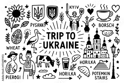Ukraine travel doodle composition with landmarks, food, culture and traditional symbols, Transparent Background