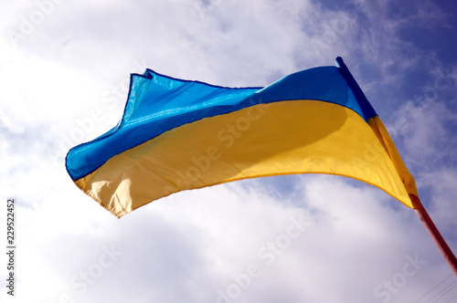 Ukrainian flag flying against the sky with clouds. Copy space. Yellow and blue colors. National symbol of Ukraine.