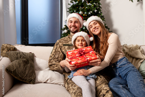 Ukrainian soldier in military uniform celebrates Christmas at home with family and gives present to little daughter in Santa hats, Ukrainian army man in camouflage hugs wife and child on New Year
