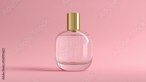Ultra quality image of round Glass Perfume Bottle Mockup with Matte Gold Cap on Pink Background.
