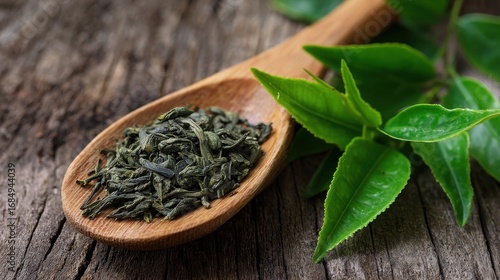 Ultra quality image of wooden spoon is filled with green tea leaves and a leafy green plant.