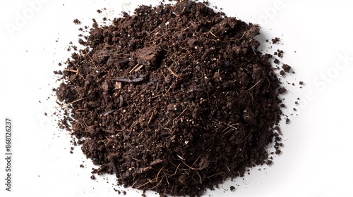 Ultra-high-definition top-down shot of dark, nutrient-rich garden soil with intricate details and textures, isolated on a white backdrop