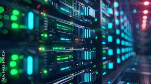 Ultra-realistic close-up of server equipment, illuminated by green and blue LED lights