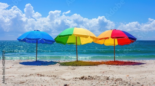 Umbrellas Beach Umbrella Trio. Colourful Beach Umbrellas Providing Shade on Summer Vacation