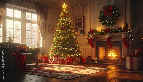 un árbol de Navidad en un salón hogareño decorado con espíritu navideño. El árbol es frondoso, iluminado con luces cálidas y adornado con bolas rojas, doradas y plateadas.