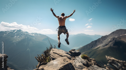 Un homme en train de sauter sur une falaise pendant sa randonnée.