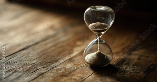 Un sablier en verre posé sur une table ancienne, le sable s'écoulant du haut vers le bas, arrière-plan avec surface en bois brun clair, concept de gestion du temps, image avec espace pour texte.