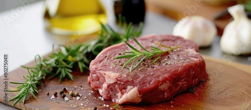 Uncooked meat. Uncooked beef steak placed on a chopping board alongside rosemary and seasonings.