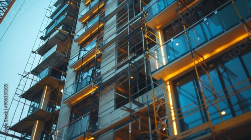 Under construction residential building with Cream color exterior view Highrise under construction building with modern design and black glass windows under construction skyscraper wit : Generative AI
