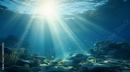 Under the sea scene with surface and sunrays reaching the seabed coral rock and fish