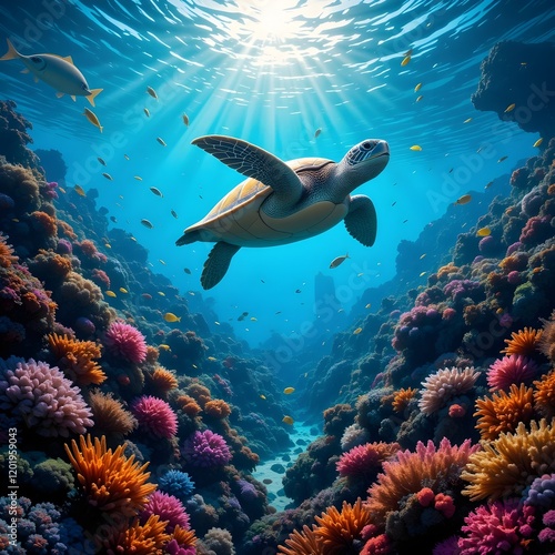 Underwater Beauty: Sea Turtle Exploring a Coral-Filled Seabed