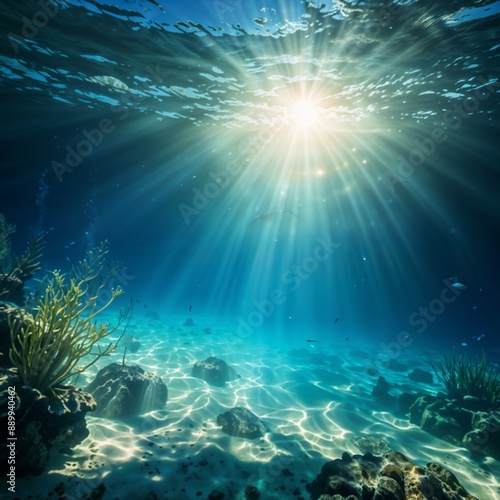 Underwater scene featuring fish swimming among coral reefs with sunlight penetrating the blue water.