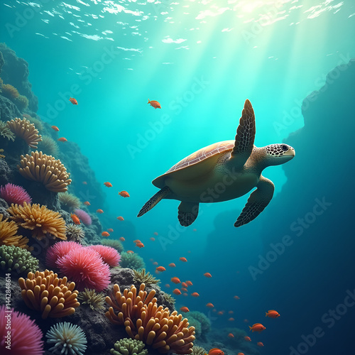 Underwater scene with a sea turtle swimming near coral reefs, AI generated