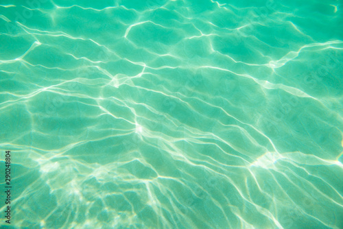 Underwater. Sun glare at the bottom of the seat. Waves underwater and rays of sunlight shining through. Deep turquoise blue sea. Ocean. Transparent water and light at sand.
