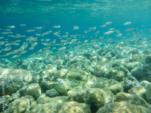 UNDERWATER view a small fish flock in the turquoise clear water and white pebbles scattered off the seabed of the Antisamos bay, Kefalonia island, Ionian Sea, Greece.